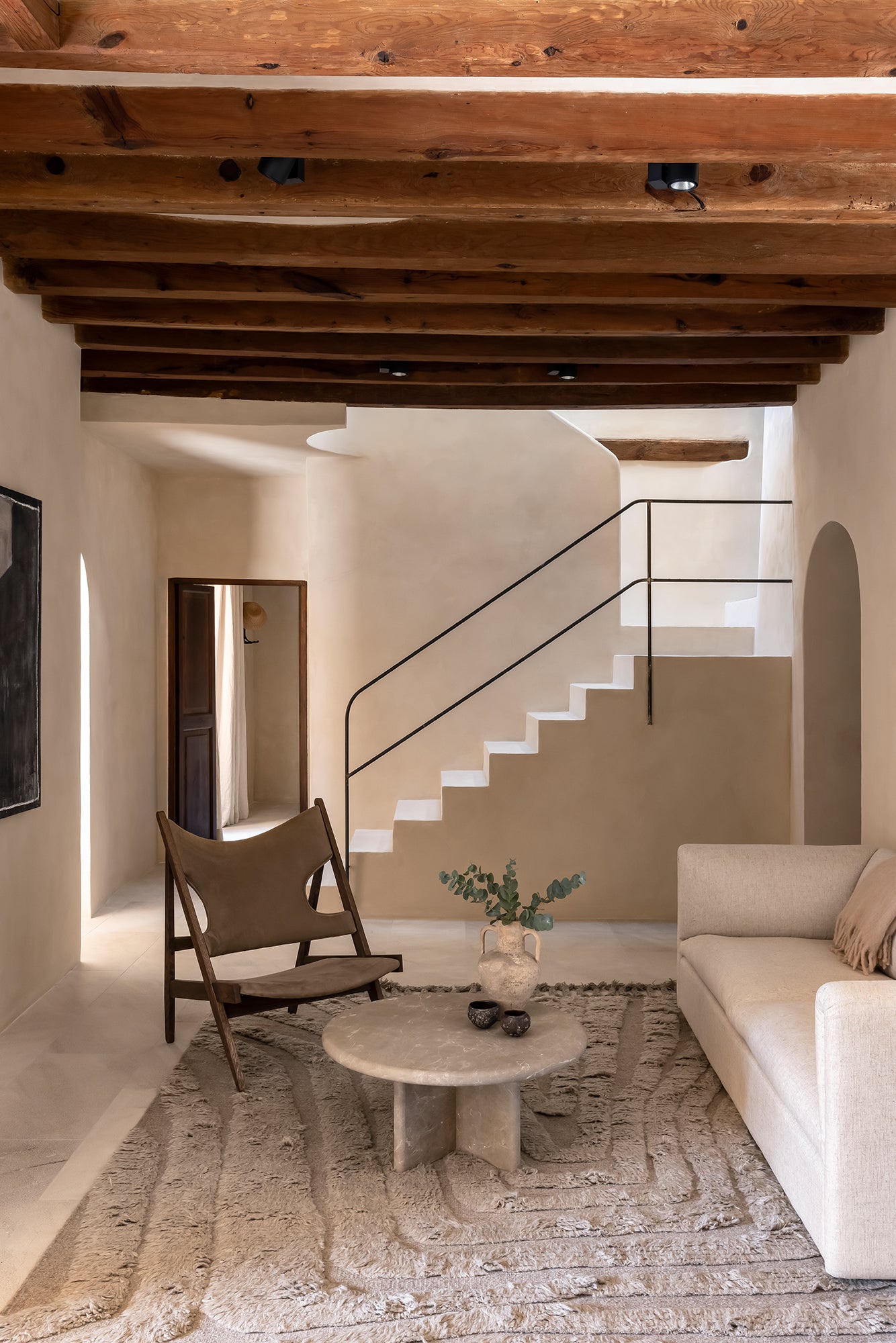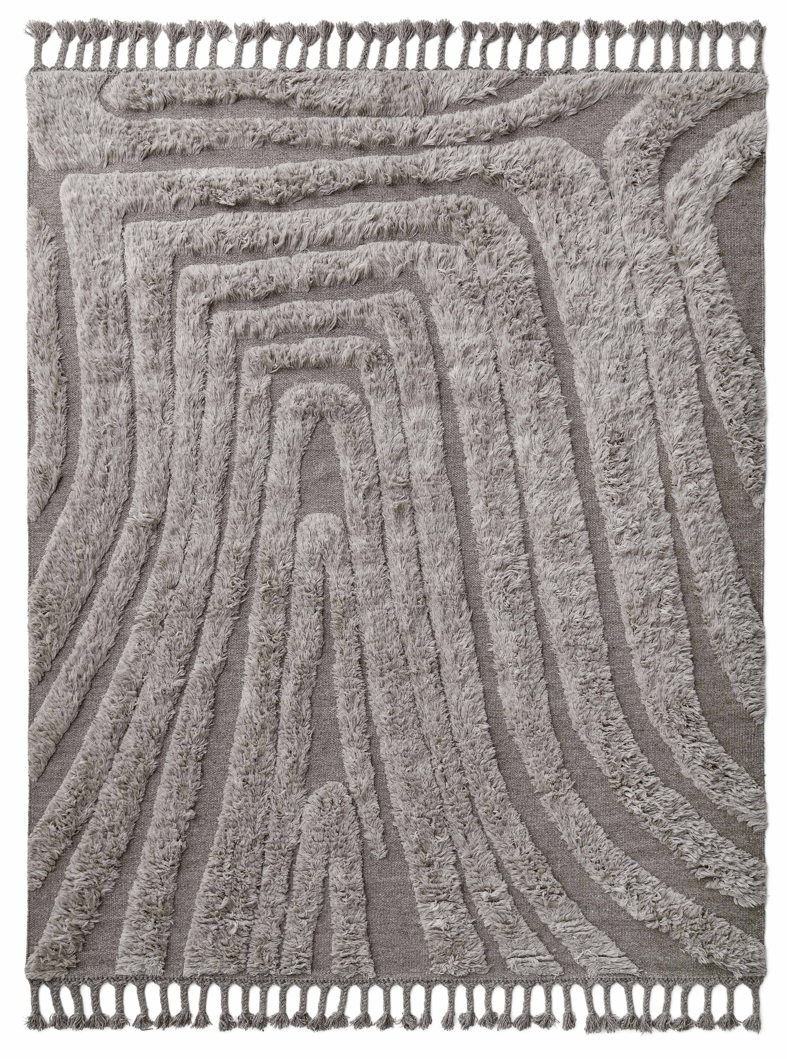 No.04 este un covor decorativ țesut manual cu fire din lână naturală. Modelul său moale și neregulat creează o atmosferă vie și intrigantă. Covorul este realizat din lână naturală și nealbită, într-un amestec de gri deschis și gri închis, similar pietrei. O margine lungă cu franjuri ridică linia de capăt și adaugă un detaliu artistic și etnic.