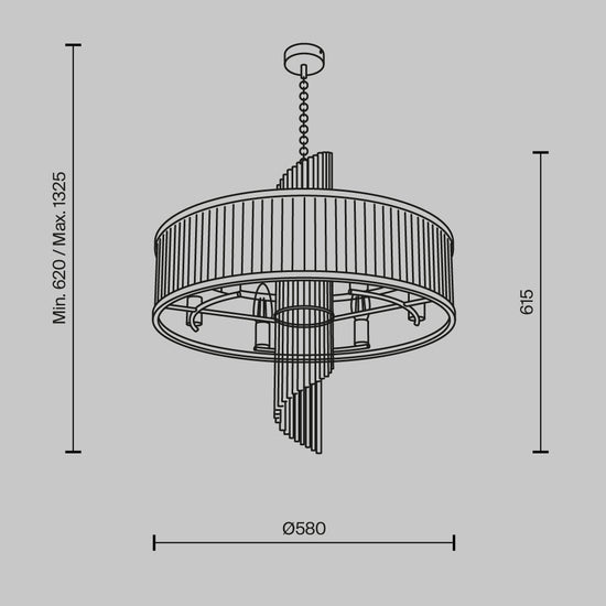 Dimensiuni: Înălțime 1325 mm (maximă), 620 mm (minimă), Diametru 580 mm