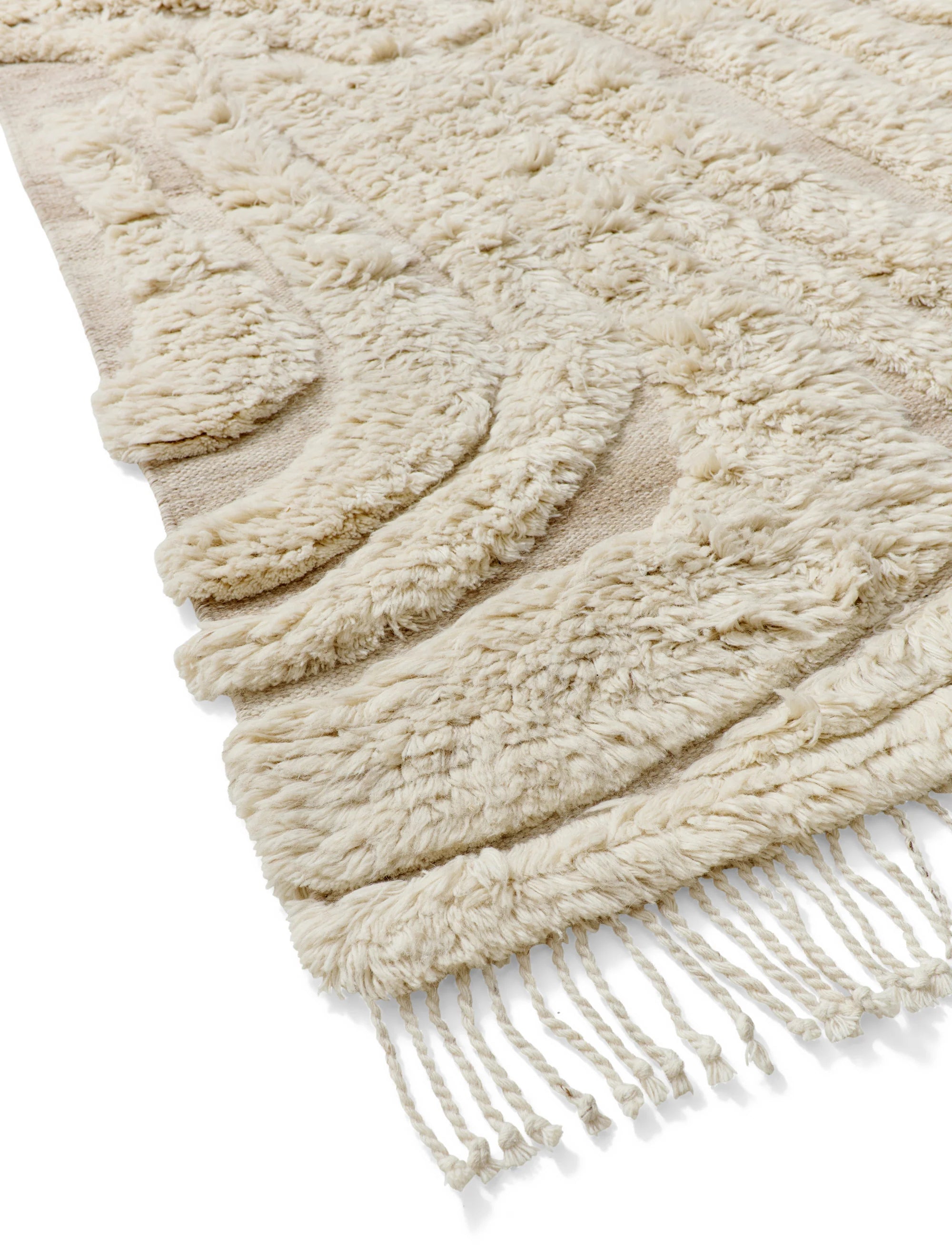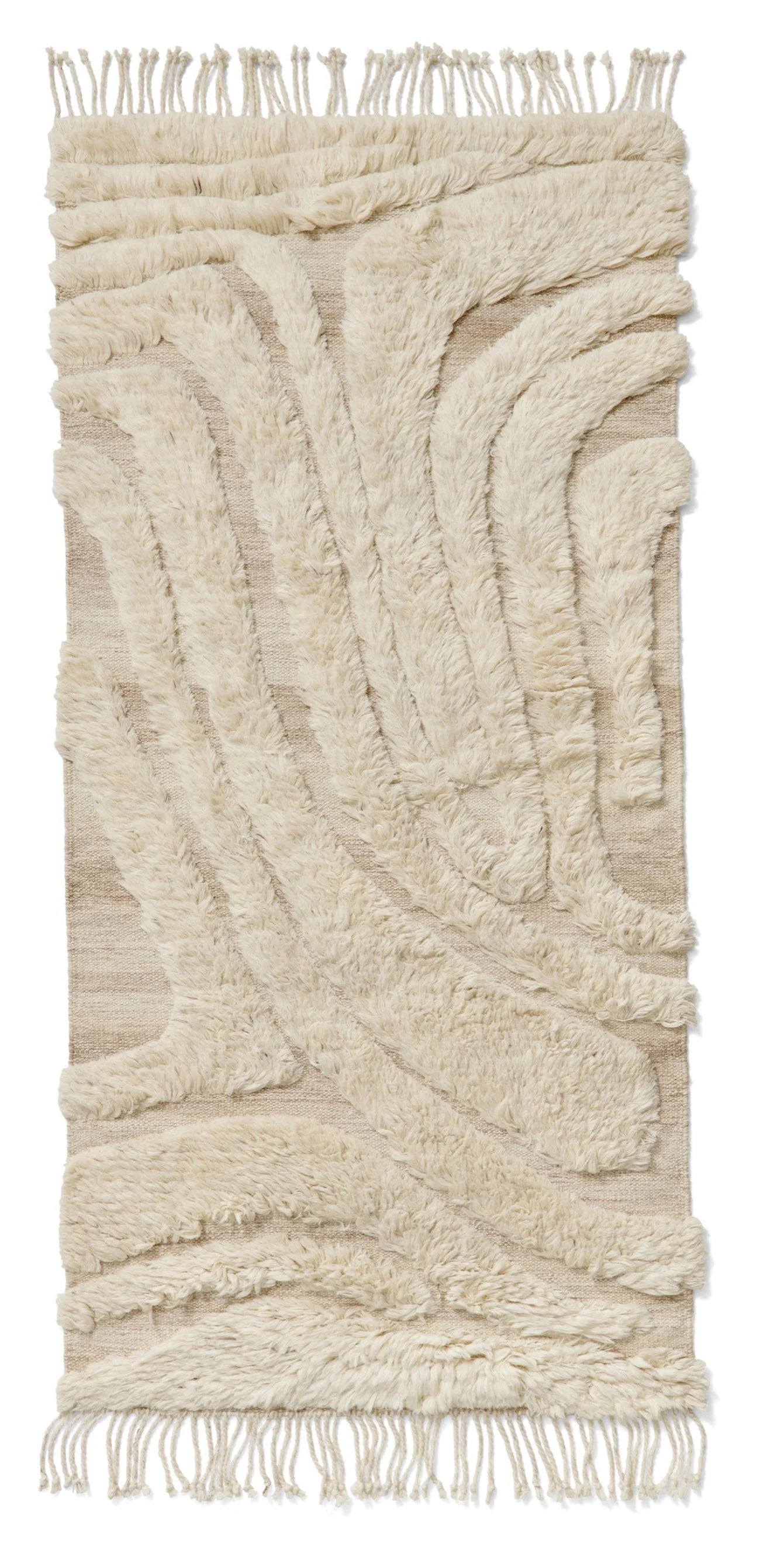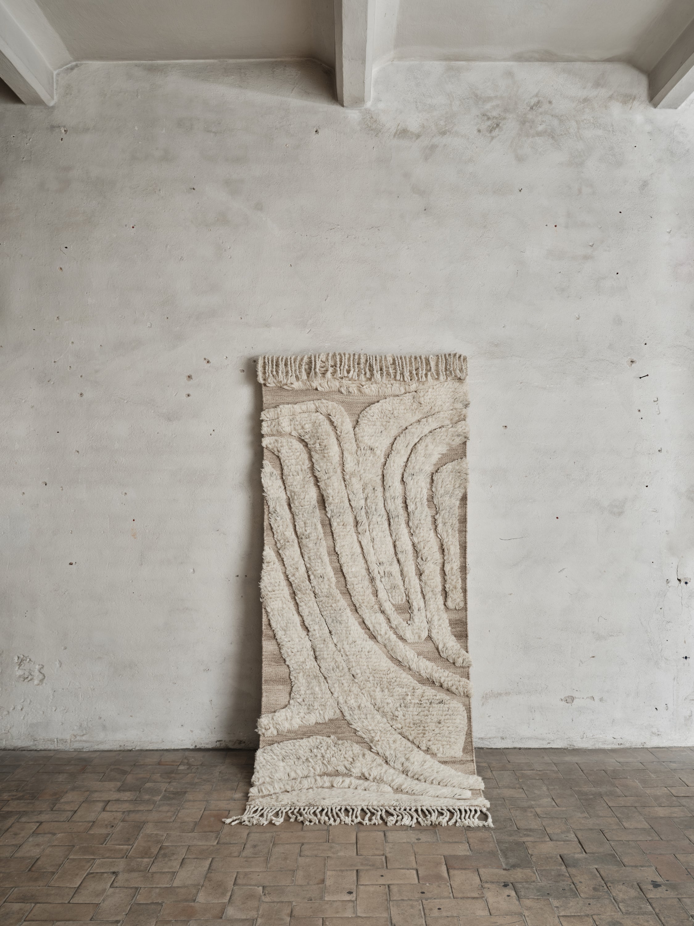 Cu un model moale și neregulat care creează o senzație vie și intrigantă. Covorul este realizat din lână naturală și neînălbită, având un înalt fir de culoare albă coajă și un suport de culoare nisipie. Franjurile lungi de pe margini îi conferă un aspect artistic.