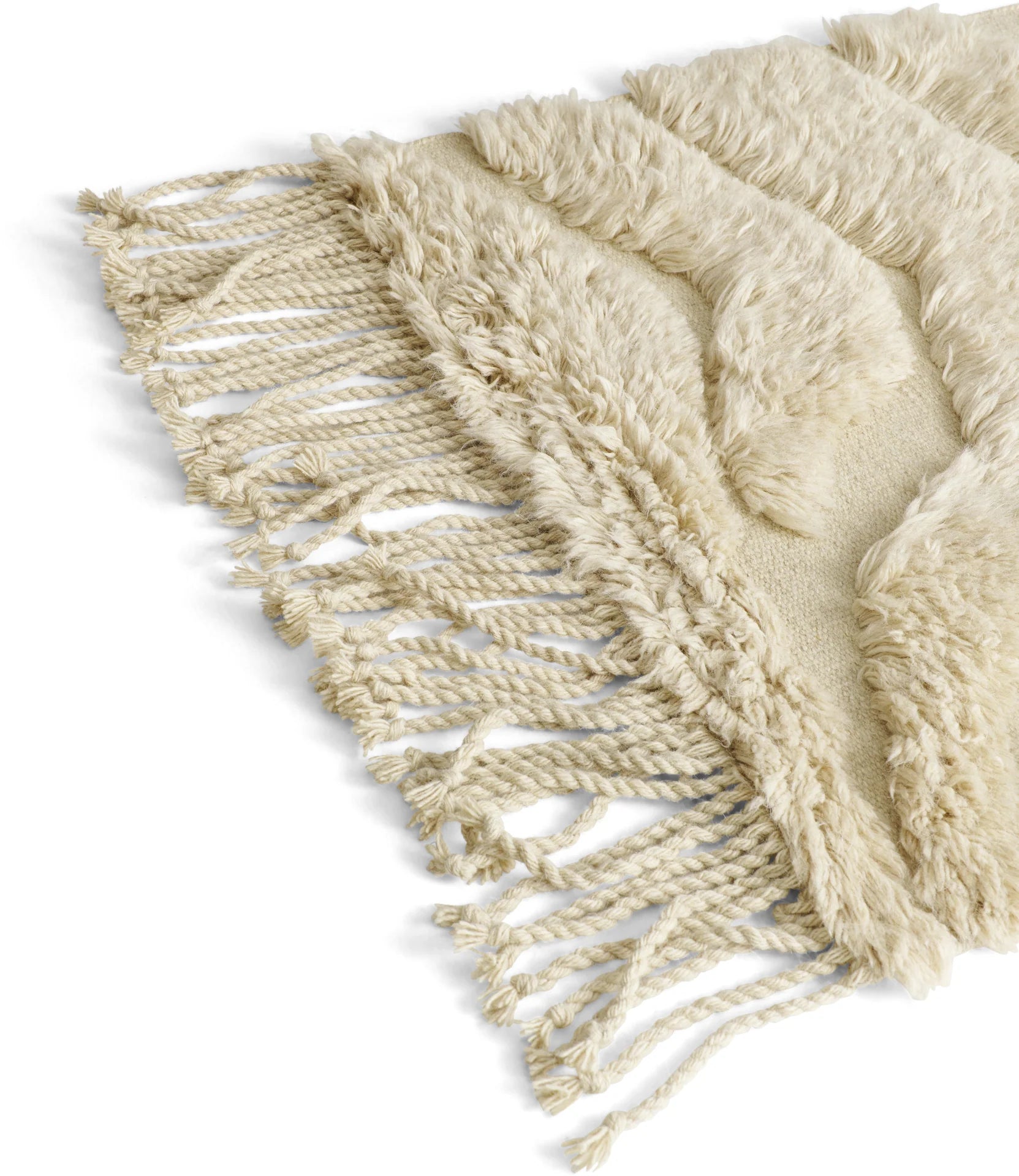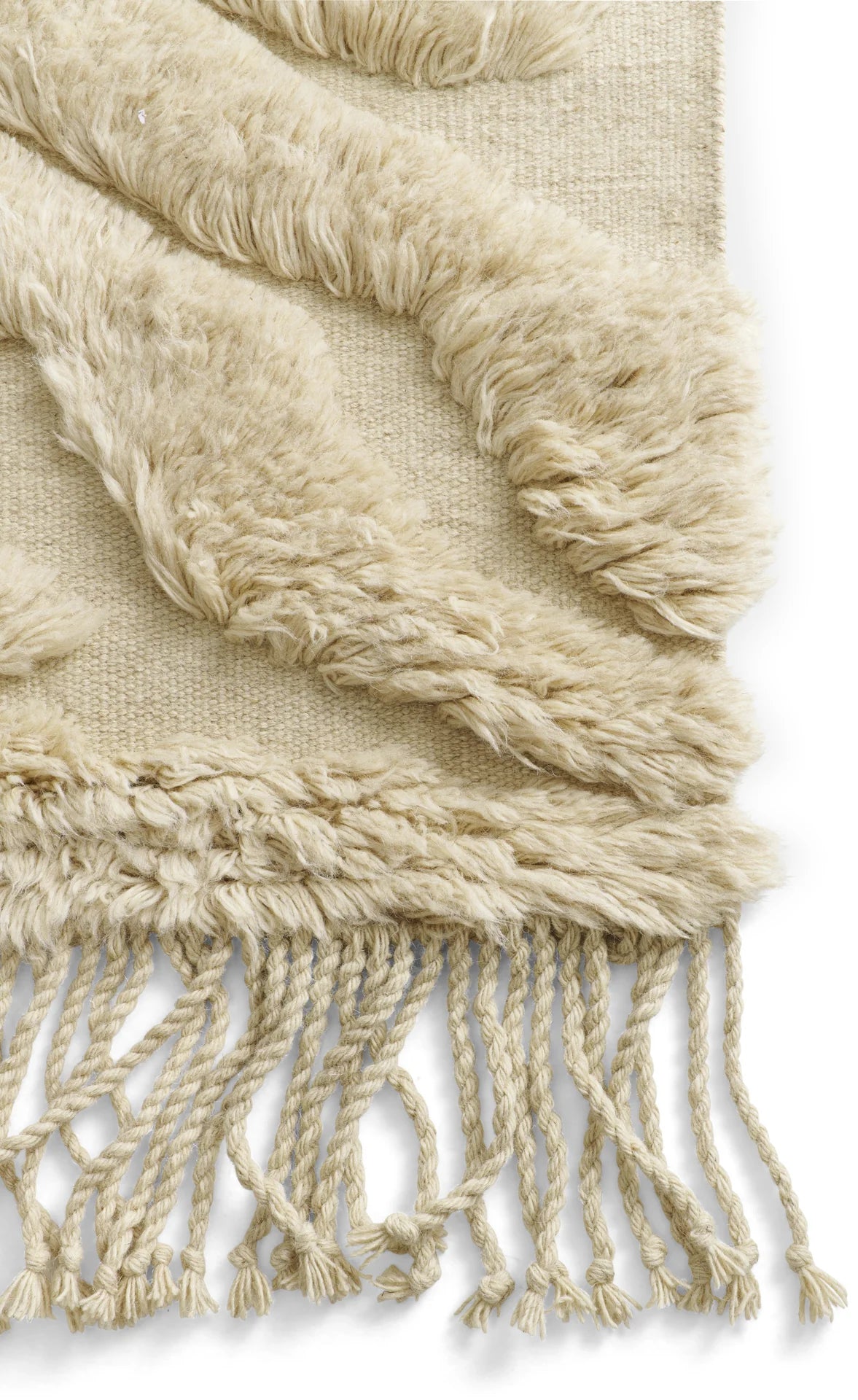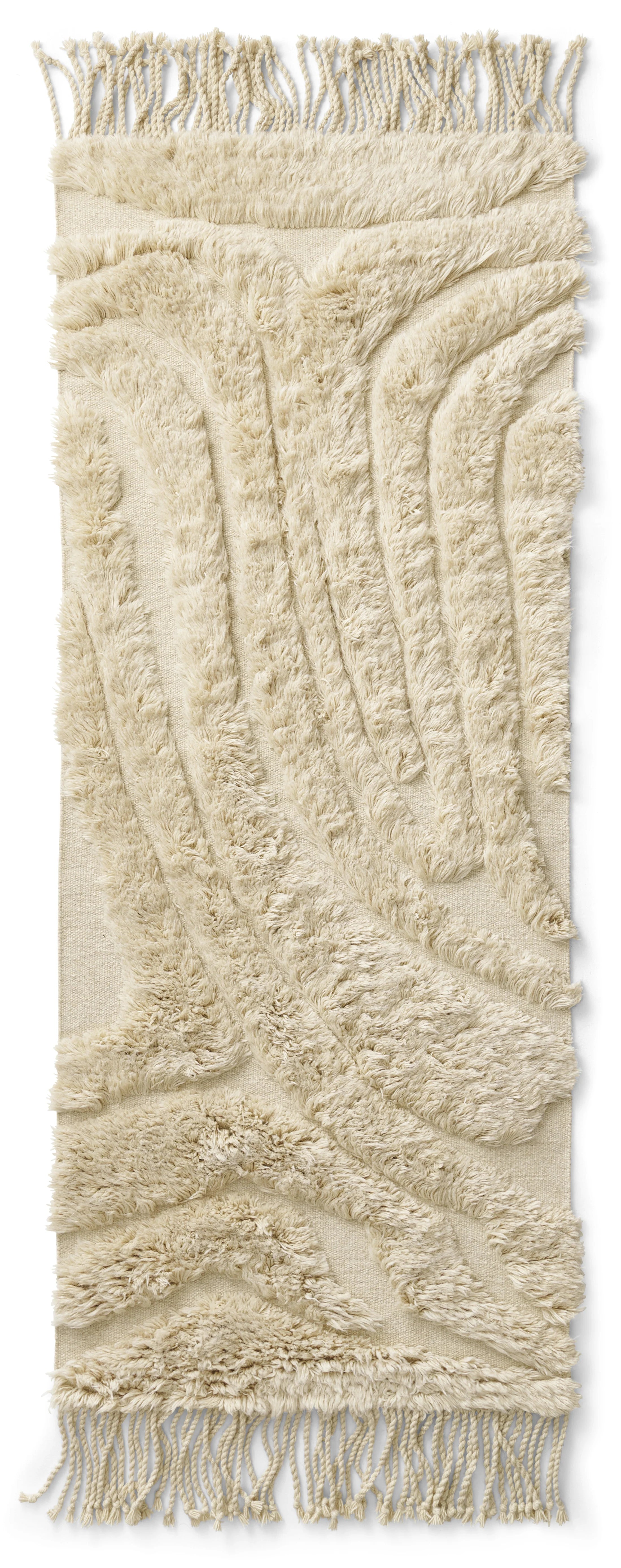 Această traversă are un model moale și neregulat care creează o senzație vie și intrigantă. Covorul este realizat din lână naturală și neînălbită, având un fir înalt de culoare bej deschis și un suport de culoare asemănătoare. Franjurile lungi de pe margini îi conferă un aspect artistic și elevat.